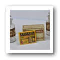 Fotografia de conjunto de Especialidades Farmacêuticas como frasco de vidro que teve Enxofre Precipitado; embalagem de Empty Gelatin Capsules; embalagem de Exclavil, emplastros; frasco de vidro que teve Cloreto de potássio; e embalagem de Magnésia Santa Maria.