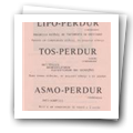 Folheto publicitário “Lipo-Perdur, Tos-Perdur e Asmo-Perdur" do Laboratório Normal. A especialidade “Lipo-Perdur” é indicada para o tratamento de obesidade, a especialidade “Tos-Perdur” é indicada como antitússico, broncodilatador e fluidificador das secreções, e a especialidade